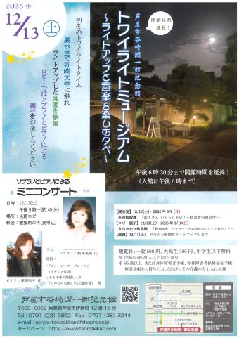 初冬のトワイライトタイム、展示室で谷崎文学に触れ、ライトアップした庭園を散策し、ロビーではソプラノとピアノによる調べをお楽しみください。